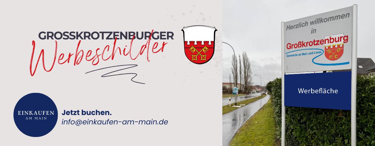 Wir bieten Ihnen Werbemöglichkeiten an den Ortseingängen von Großkrotzenburg. Regionale Unternehmen sowie Vereine haben die Möglichkeit über Einkaufen am Main eine Werbefläche für einen bestimmten Zeitraum zu mieten. Die Größe der Werbetafeln beträgt 150 x 70 cm.